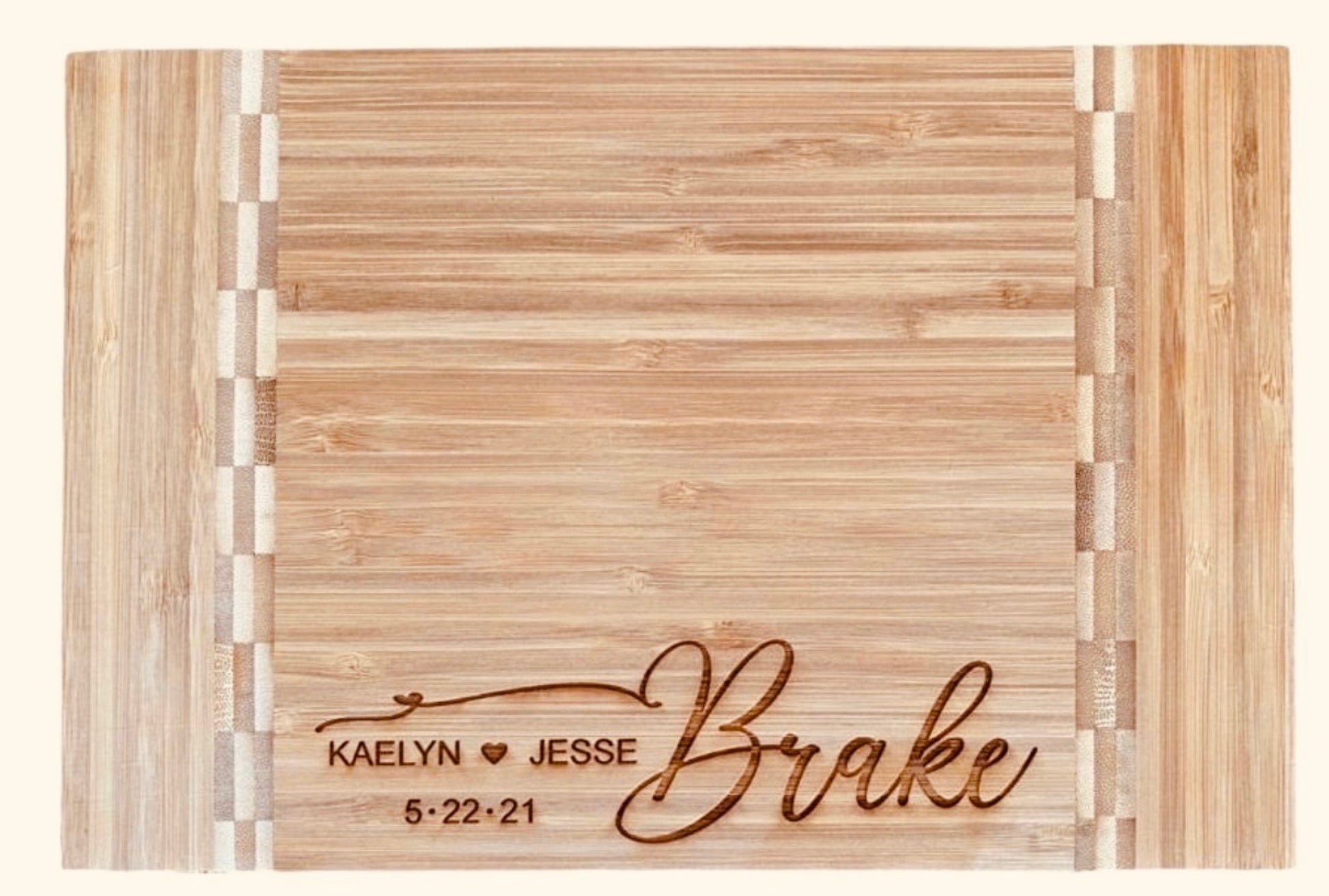 12 x 8 1/4 " Rectangle Bamboo Cutting Board with Butcher Block Ends. Bamboo includes natural variations in color in wood grain and engraving, adding to the uniqueness of each piece. Your custom design will have a richly toned, deeper hue than the cutting board itself when engraved.